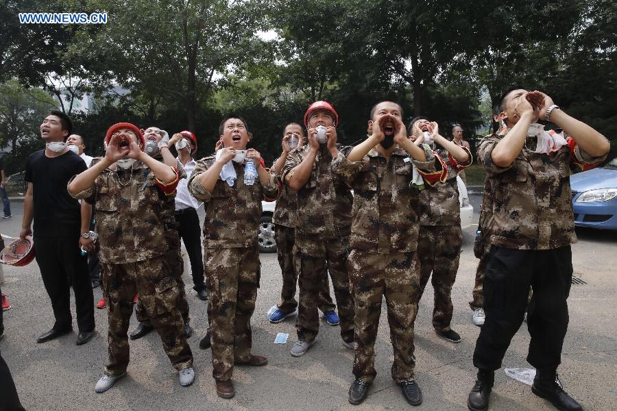 Staff members cry to call back residents who go upstairs to fetch their personal materials after getting an evacuation order outside a residential building near the core area of explosion site in Tianjin, north China, Aug. 15, 2015. All people within 3-km radius are required to evacuate from Tianjin blasts site. (Xinhua/Shen Bohan)