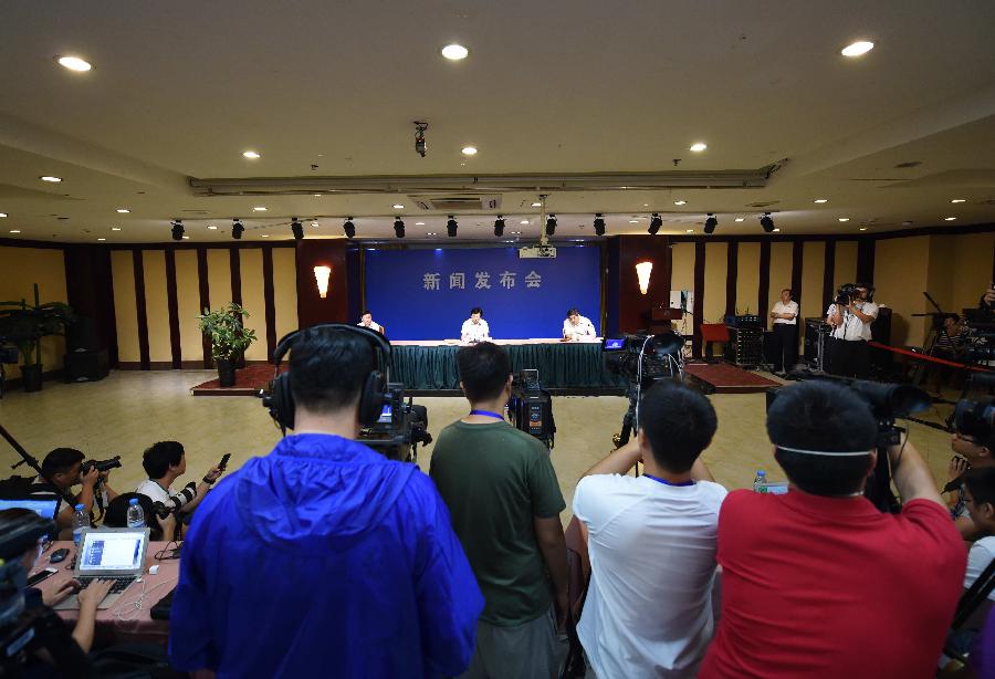 | A press conference is held to notify the Tianjin explosion event in Tianjin, north China, Aug. 15, 2015. Gao Huaiyou, vice head of the Tianjin bureau of work safety, said that chemicals stored in the warehouse possibly include sodium cyanide, but further confirmation is needed. The containers were not open, and some were not even registered. Some local media reported earlier that Rui Hai Logistics, owner of the warehouse, had as much as 700 tonnes of sodium cyanide, but Gao said it was not yet verified. Measures have been taken to prevent secondary disasters, such as inviting sodium cyanide producers to help at the site, using hydrogen peroxide to reduce the amount of sodium cyanide, sending a taskforce to locate and measure the contaminated area and prevent its spread in sewage. Some other dangerous chemicals likely to be stored include potassium nitrate and ammonium nitrate. (Xinhua/Zhang Chenlin) |