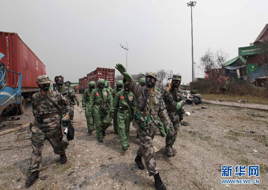 A group of specialized anti-chemical warfare soldiers enter the core area of the Tianjin blasts site to search for survivors on August 15, 2015. [Photo: News.cn]
