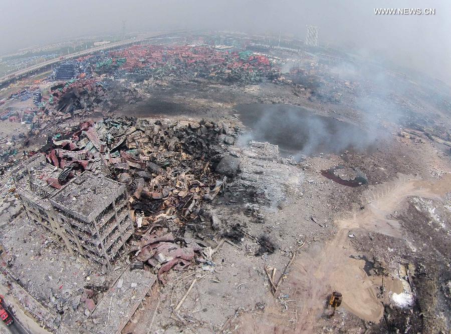 Photo taken on Aug. 15, 2015 shows an aerial view of the warehouse explosion site in Tianjin, north China. Death toll rose to 104 from the massive warehouse explosions hitting north China's Tianjin city Wednesday night, local authorities said on Saturday night. (Xinhua/Yue Yuewei)