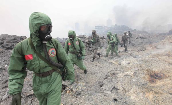 A team of 214 military specialists in handling nuclear and biochemical materials has arrived in the northern Chinese city of Tianjin on Thursday following Wednesday's warehouse explosion.