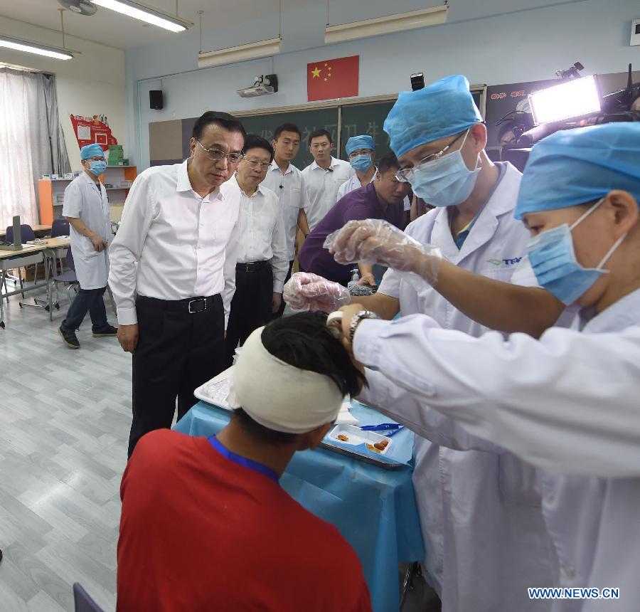 Chinese Premier Li Keqiang (2nd L) visits residents injured in the massive warehouse blasts at a temporary relocation site in Tianjin, north China, Aug. 16, 2015. Li visited fire fighters, rescuers and those injured in the calamity. Li also directed further rescue operations and treatment of the injured, as well as handling of the aftermath and production safety. (Xinhua/Zhang Duo)