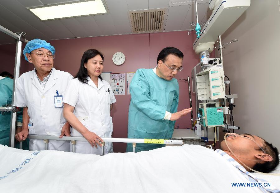 | Chinese Premier Li Keqiang (3rd L) visits a fire fighter injured in the massive warehouse blasts at a hospital in Tianjin, north China, Aug. 16, 2015. Li visited fire fighters, rescuers and those injured in the calamity. Li also directed further rescue operations and treatment of the injured, as well as handling of the aftermath and production safety. (Xinhua/Zhang Duo) |