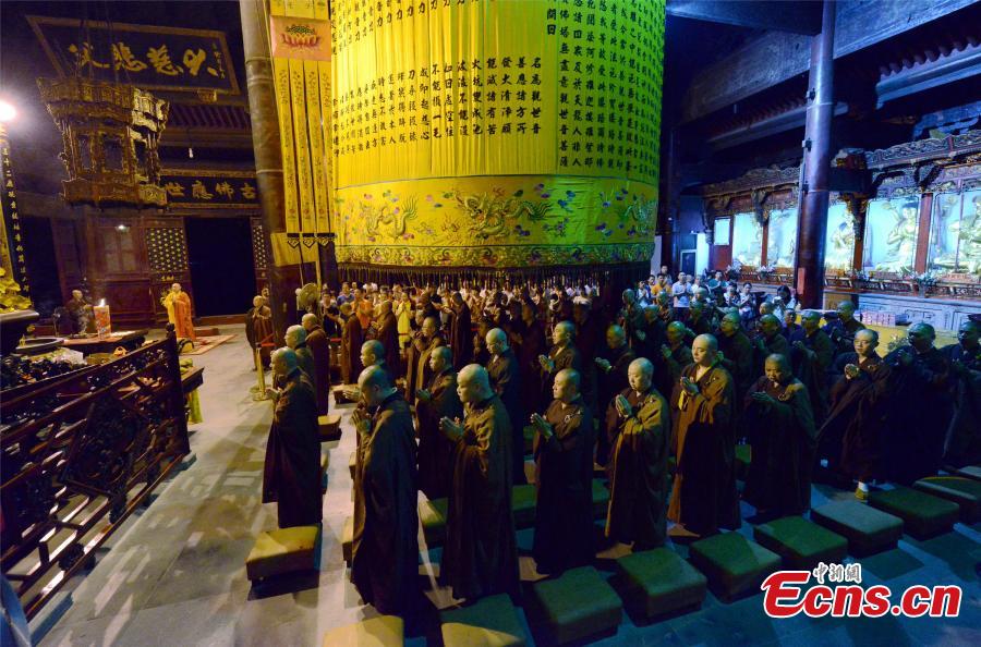 Monks pray for the victims of the Tianjin explosions at Mount Putuo in East China’s Zhejiang province, Aug 15, 2015. More than 1,000 monks attended the prayer service at Mount Putuo, one of the four sacred mountains in Chinese Buddhism. (Photo: China News Service/Chang Qi)