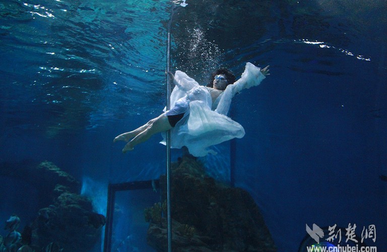 An underwater pole dance show is held at Wuhan Polar Ocean World, Aug. 14, 2015. The performer was Zhang Mingli, who is a polar dance instructor. She said it is much harder to perform pole dance under water since the pressure was difficult to control. (Photo/Cnhubei.com)