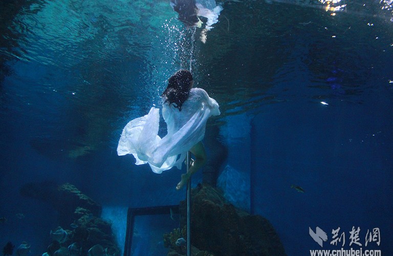 An underwater pole dance show is held at Wuhan Polar Ocean World, Aug. 14, 2015. The performer was Zhang Mingli, who is a polar dance instructor. She said it is much harder to perform pole dance under water since the pressure was difficult to control. (Photo/Cnhubei.com)
