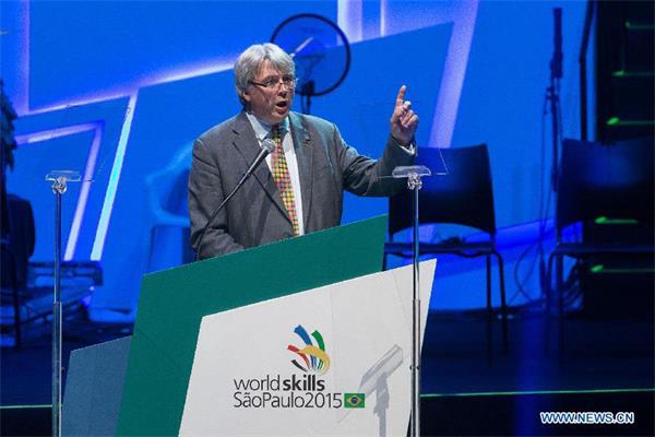President of Worldskills International Simon Bartley addresses the opening ceremony of the 43rd Worldskills in Sao Paulo, Brazil, Aug. 11, 2015. The 43rd Worldskills, the world's largest international skill competition, kicked off in Sao Paulo on Wednesday. More than 1,000 competitors would compete in 50 skill competitions. The Chinese team had 32 competitors to compete in 29 skills. [Photo: Xinhua/Xu Zijian]