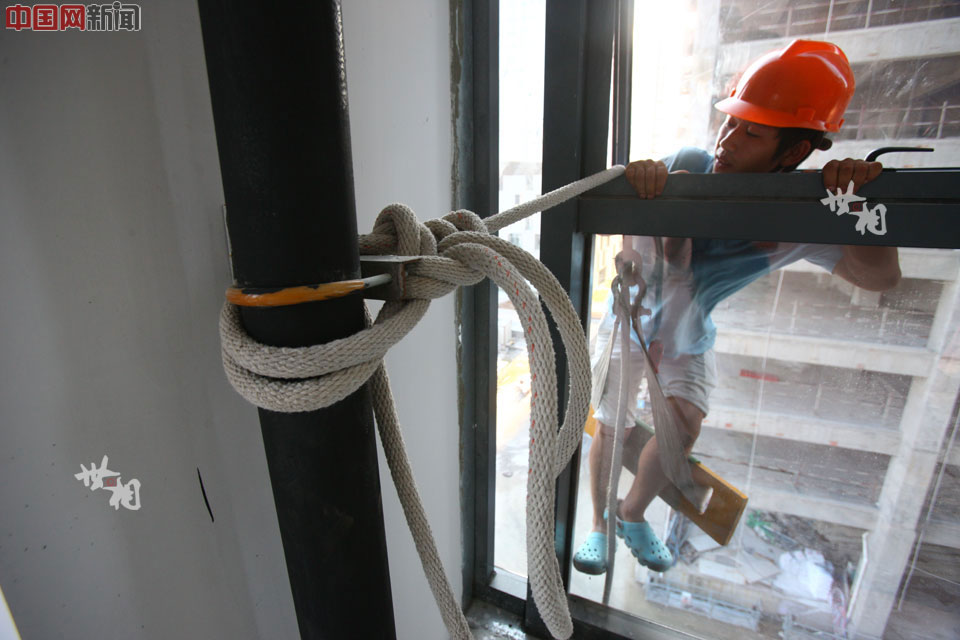 Wei ties himself with a rope and climb out of the window to fix the neon lights. (China.com.cn/Zhang Peijian)