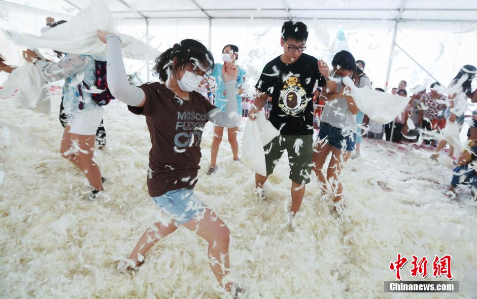 A pillow fight in Nanjing attracts many young people to participate in on Aug. 15, 2015. People chased each other and hit each other with pillows, releasing their pressure and making friends. (Chinanews/Yang Bo)