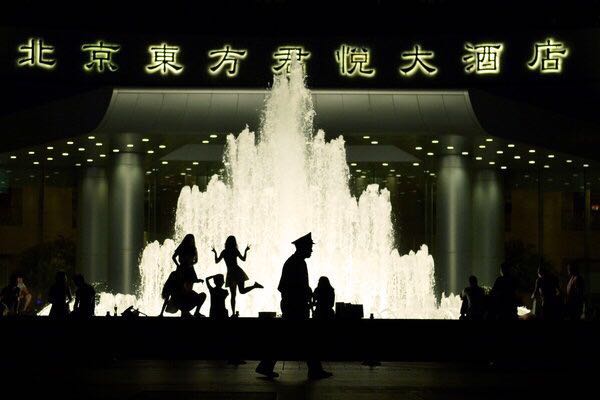| People have fun in front of a fountain at a luxury hotel in Beijing |