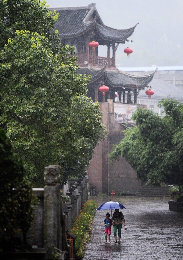 | A woman and her son walk in the rain in Fenghuang, Hunan |