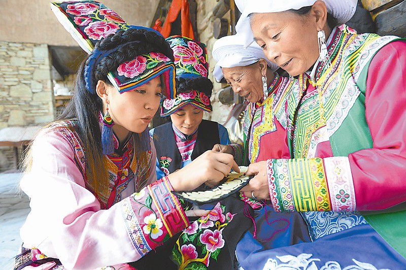 The twin sisters learn traditional Qiang embroidery skills from the senior. (Sichuan Daily/Li Xiangyu)