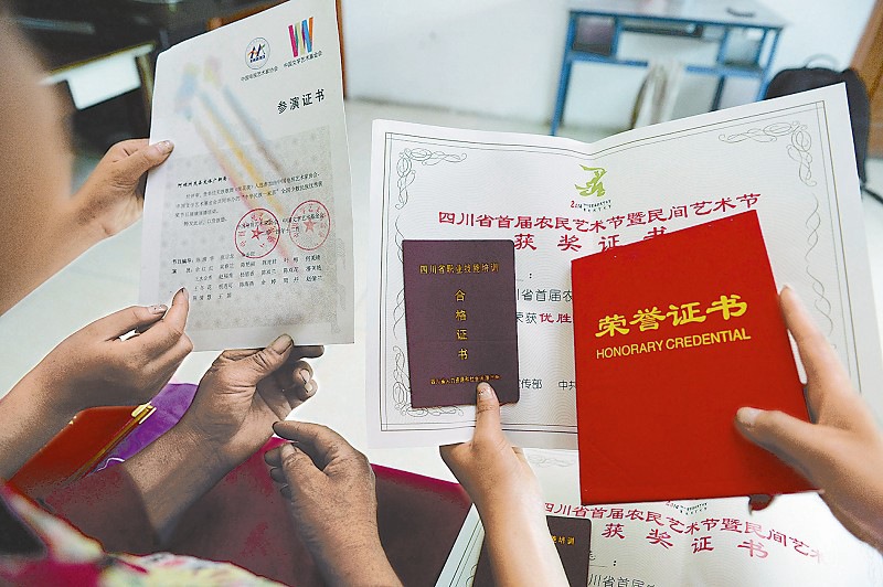 The twin sisters present the awards for protecting cultural heritage of Qiang. (Sichuan Daily/Li Xiangyu)