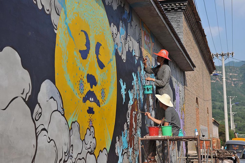 Two artists create murals in the village. Protecting ancient villages does not just mean renovating old houses; it also means respecting cultural roots and traditions. (Xinhua/ Zhanyan)