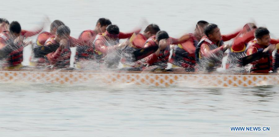 Athletes from Jiangsu team compete during the 5,000 meters men’s dragon boats racing around race marks on Aug.6, 2015. (Xinhua/Li Xin)