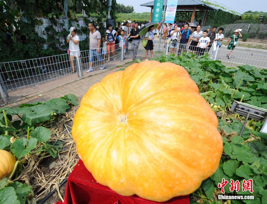 A 150 kg pumpkin is exhibited in the 14th Changchun Agricultural Expo Park in Changchun, capital of northeast China's Jilin province on Aug 17, 2015. The giant pumpkin which is not edible attracted many visitors. (CNS/ Zhang Yao)