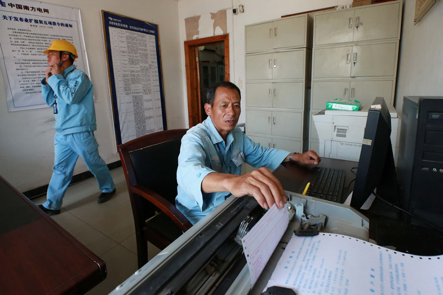 Luo Zhenxi prints bill statement at office. (Xinhua / Liu Jiaoqing)