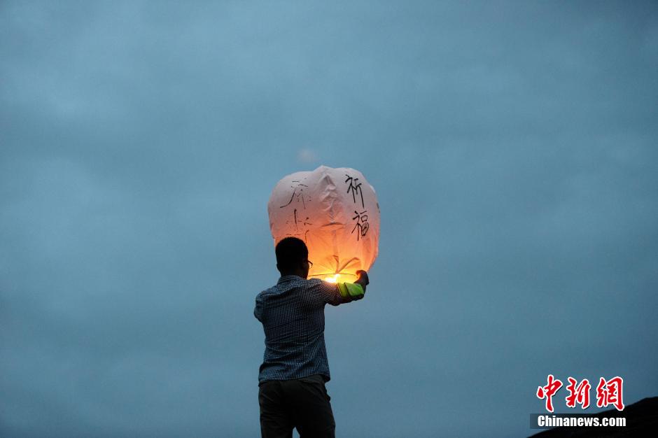 On Aug. 18, people pray for victims of Tianjin blasts as they light up the Kongming lanterns in a square of Yueyang, central China’s Hunan Province. According to Chinese tradition, the seventh day after one's death is an occasion for the relatives of deceased to mourn the passing of their loved ones. (Yang Huafeng / Chinanews)