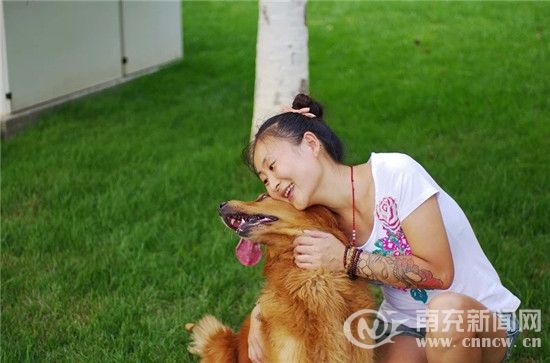 Yue Xiaohong poses for a photo with the dog she trains. (cnncw.cn/ Xu Siqian)