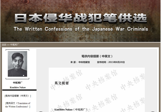 A screenshot from the official website of the State Archives Administration showing a summary of the confession made by Japanese WWII criminal Kunihiro Nakao. [Photo: Crienglish.com]
