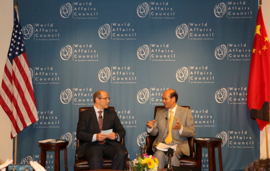 | Luo Linquan, Chinese consul general to San Francisco (R) and former American ambassador to Australia (L) are present at the World Affairs forum on August 19, 2015. (Photo provided by Sun Jia) |