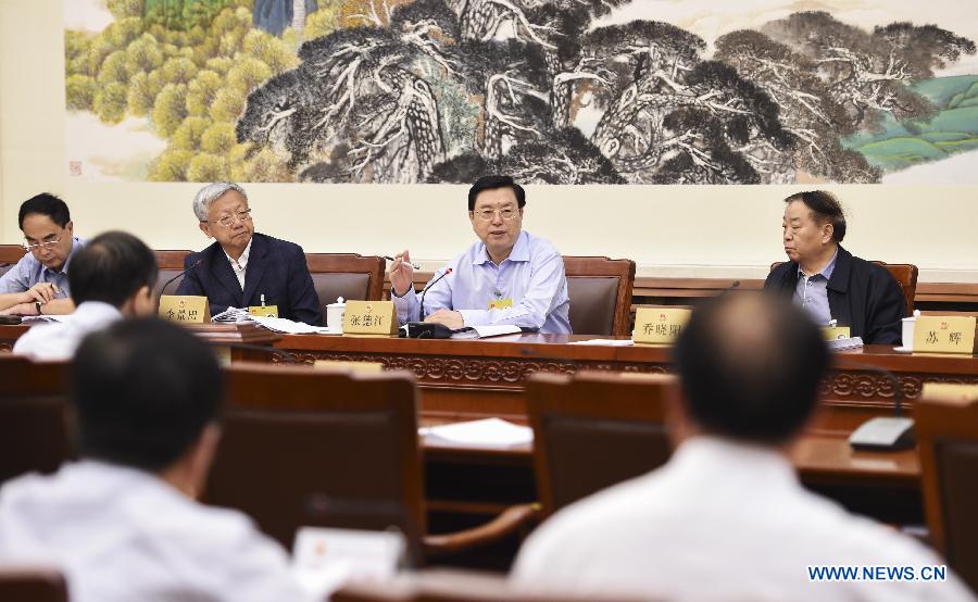 Zhang Dejiang(2nd R rear), chairman of the Standing Committee of China's National People's Congress (NPC), attends a grouping discussion of the 16th meeting of the 12th NPC Standing Committee, in Beijing, capital of China, Aug. 26, 2015. (Xinhua/Xie Huanchi)