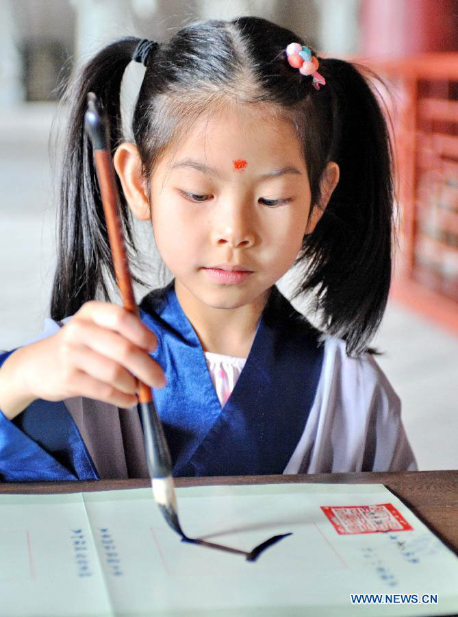 A new first-grader writes a Chinese character during a first writing ceremony at the Confucius Temple in Fuzhou, capital of southeast China's Fujian Province, Aug. 30, 2015. Ten new first-graders in Fuzhou participated in the first writing ceremony Sunday. The ceremony is a traditional education activity for children who will start their school life in China. [Photo: Xinhua]