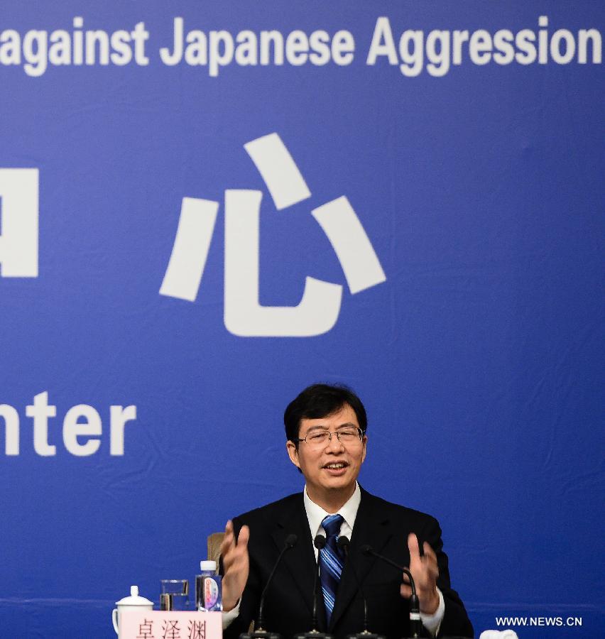 Zhuo Zeyuan, professor of the Party School of the Communist Party of China (CPC) Central Committee, answers questions of journalists during the 3rd press conference of the press center of the commemoration activities of the 70th anniversary of the victory of Chinese People's War of Resistance Against Japanese Aggression and World Anti-Fascist War in Beijing, capital of China, Aug. 31, 2015. (Xinhua/Li Xiang)