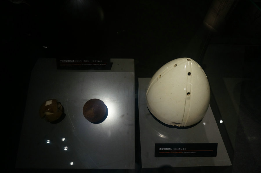 Ceramics bacteria warhead (collected in Japan) on display. [Photo by He Keyao/chinadaily.com.cn]