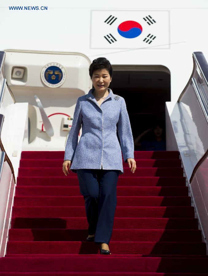 South Korean President Park Geun-hye arrives at the Beijing Capital International Airport in Beijing, capital of China, Sept. 2, 2015, to attend events commemorating the 70th anniversary of the victory in the Chinese People's War of Resistance Against Japanese Aggression and the World Anti-Fascist War. (Xinhua/Xiao Yijiu)