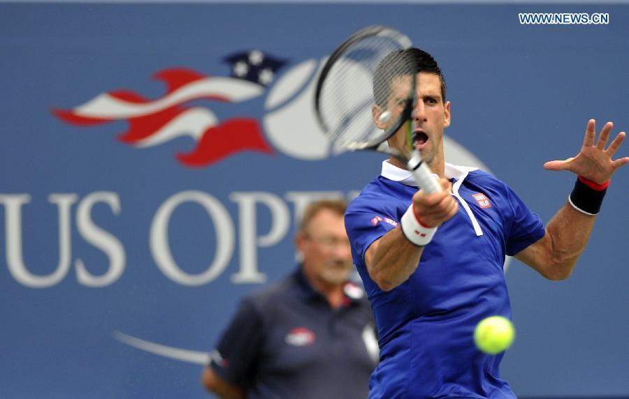 Novak Djokovic of Serbia returns a ball during the men's singles third round match against Andreas Seppi of Italy at the 2015 US Open in New York, the United States, Sept. 4, 2015. Novak Djokovic won 3-0 to enter the next round. (Xinhua/Wang Lei)