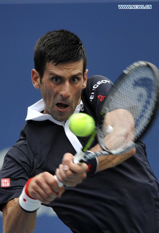 Novak Djokovic of Serbia returns a ball during the men's singles third round match against Andreas Seppi of Italy at the 2015 US Open in New York, the United States, Sept. 4, 2015. Novak Djokovic won 3-0 to enter the next round. (Xinhua/Wang Lei)