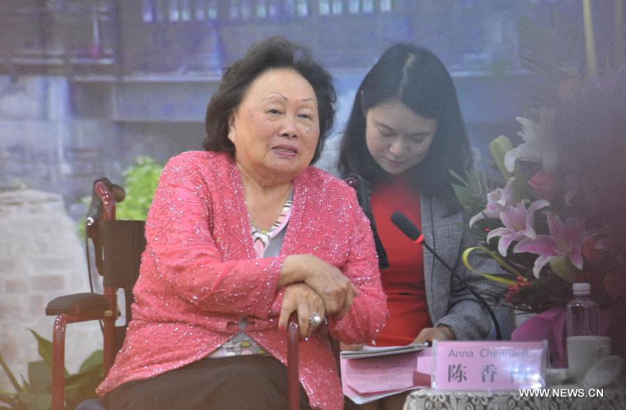 Anna Chan Chennault, wife of American pilot Claire Chennault, who volunteered to fight against the Japanese air force during the World War II, meets meida in Zhijiang, central China's Hunan Province, Sept. 4, 2015. Anna Chan Chennault arrived in Zhijiang on Friday afternoon and will visit the Flying Tigers Memorial. (Xinhua/Long Hongtao)