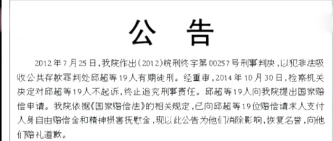The announcement in the Bozhou Evening News, said the court apologized and withdrew the verdicts to reinstate the good reputation of the defendants.
