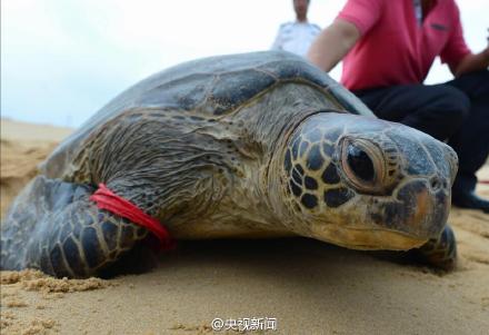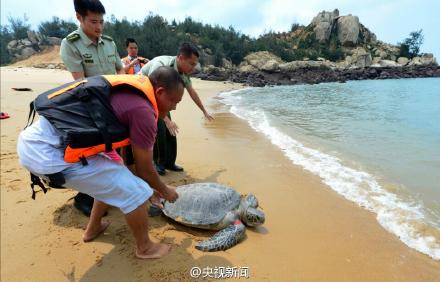 On Sept 8, the healed green turtle was set free back to the sea. Green turtle is a second class national protected animal.