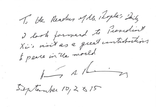 After this interview, Dr. Kissinger wrote to the readers of People's Daily as following: