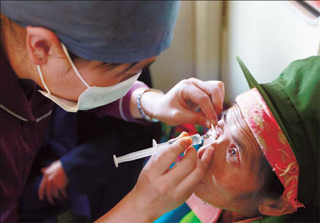 A nurse prepares a cataract patient for an operation on the Lifeline Express in Chuxiong, Yunnan province. [Photo:Xinhua]