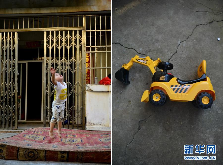 Left picture: Liang Zihan, 3, plays on a mattress in front of the house in Runxi village, Nanchang city, Jiangxi Province.