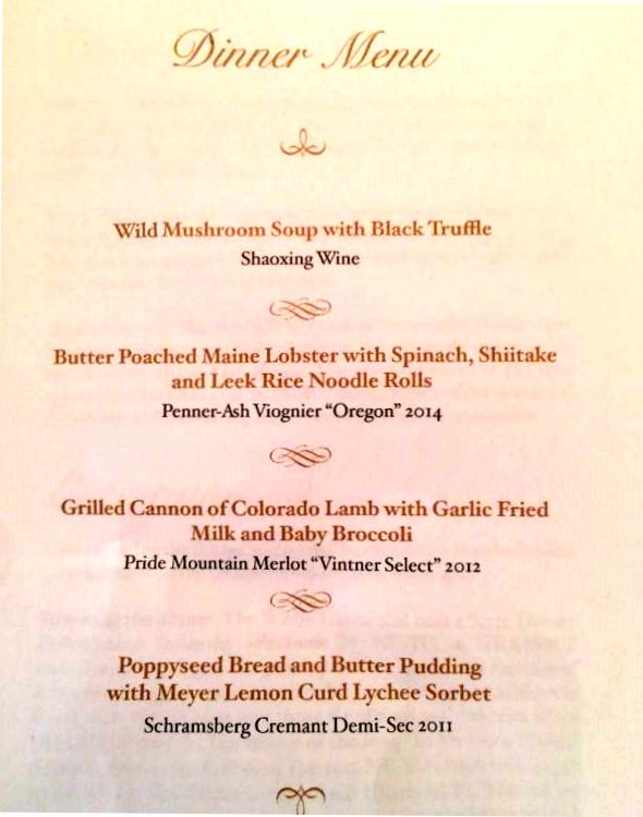 For dessert, they'll have a poppyseed bread and butter pudding. Chinese touches include the Shaoxing wine served with the soup and the lychee sorbet that is part of the dessert course. Besides, pumpkin moon cakes were served as well for the upcoming traditional Chinese festival—Mid-autumn festival. The chefs said they used Chinese and American flavors and drew inspiration from autumn.