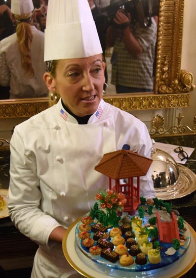 The dessert called "a stroll through the garden" composed of handmade chocolate pavilion and bridge, pulled sugar roses, and white lotus flowers, that symbolize good fortune, is shown during a preview in the State Dining Room of White House in Washington, Thursday, Sept. 24, 2015, for the state dinner of the visiting Chinese President Xi Jinping.(CNS/Diao Haiyang)