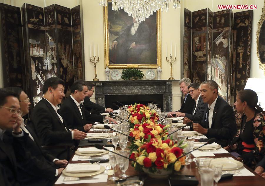 Chinese President Xi Jinping (3rd L) meets with U.S. President Barack Obama (2nd R) at the Blair House in Washington D.C., the United States, Sept. 24, 2015. (Xinhua/Lan Hongguang)