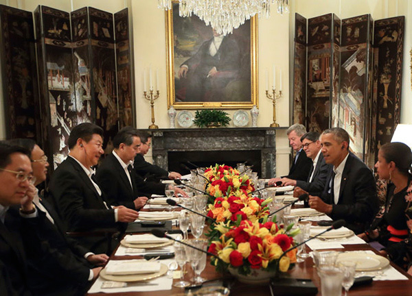 US President Barack Obama hosts a private dinner for Chinese President Xi Jinping at Blair House in Washington DC, September 24, 2015. [Photo by Lan Hongguang/Xinhua]
