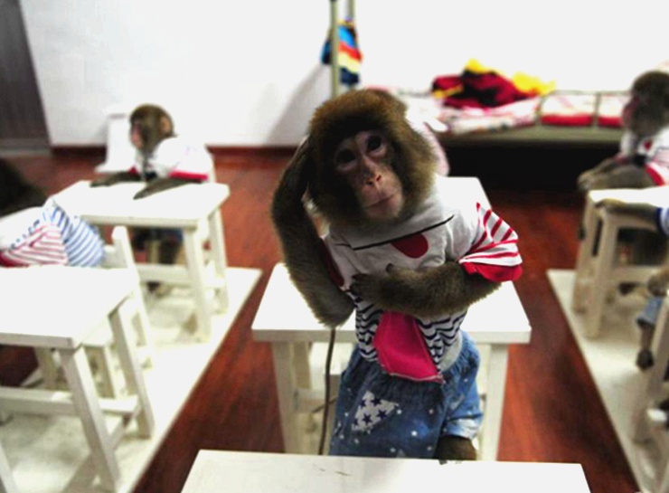China’s first monkey school opens in Dongying, Shandong province on September 24, 2015. Thirty Japanese macaques, commonly known as snow monkeys learns shaking hands, salutes and counting numbers at the school. (Iqilu.com/Zhang Wei)