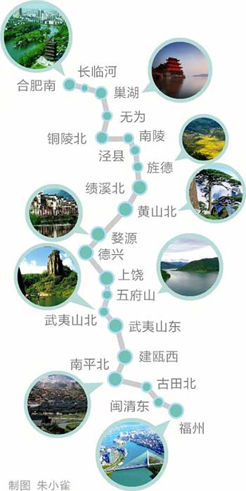 X. The most beautiful high-speed rail: With a design speed of 300km/h, the 848-km Hefei-Fuzhou HSR runs through Anhui, Jiangxi and Fujian provinces and eight well-known scenic spots.