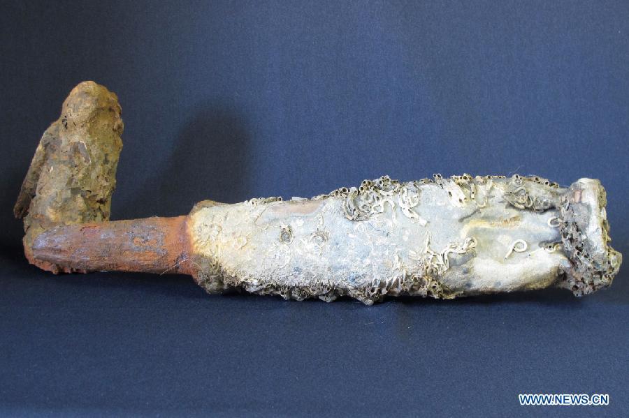 Photo taken on Sept. 26, 2015 shows a shell from "Dandong No.1", a shipwreck discovered last year near Dandong Port, northeast China's Liaoning Province. An archeological team from the National Center of Underwater Cultural Heritage have salvaged more than 100 items from the wreck during the past two months. They confirmed "Dandong No.1" as cruiser Zhiyuan, one of the warships of the Beiyang Fleet sunk by the Japanese navy during the first Sino-Japanese War 121 years ago. (Photo/Xinhua)