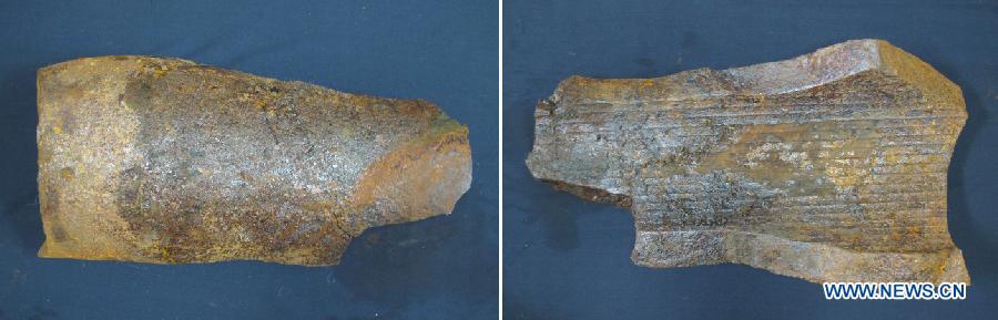 Combined photo taken on Sept. 26, 2015 shows parts of a main gun barrel from "Dandong No.1", a shipwreck discovered last year near Dandong Port, northeast China's Liaoning Province. An archeological team from the National Center of Underwater Cultural Heritage have salvaged more than 100 items from the wreck during the past two months. They confirmed "Dandong No.1" as cruiser Zhiyuan, one of the warships of the Beiyang Fleet sunk by the Japanese navy during the first Sino-Japanese War 121 years ago. (Photo/Xinhua)