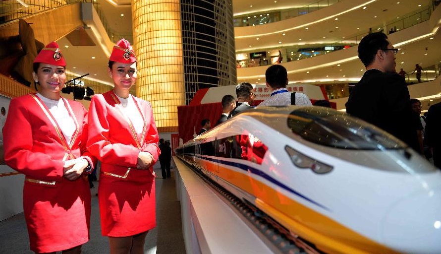 File photo: Indonesian models view scale models of Chinese-made bullet trains on exhibition at a shopping mall in Jakarta.