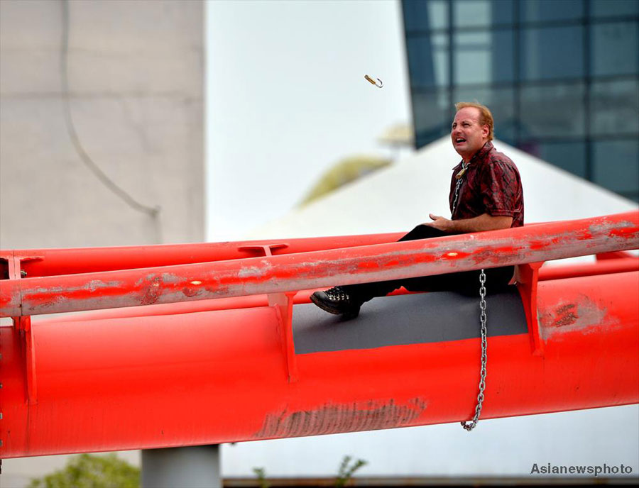 Magician Dean Gunnarson is locked on the track of the roller coaster at a theme park in Wuhan, in central China's Hubei Province on September 28, 2015. Gunnarson quickly removed his handcuffs and iron chains over his body, and disengaged the last shackle just before the rollercoaster approached. [Photo: Asianewsphoto]