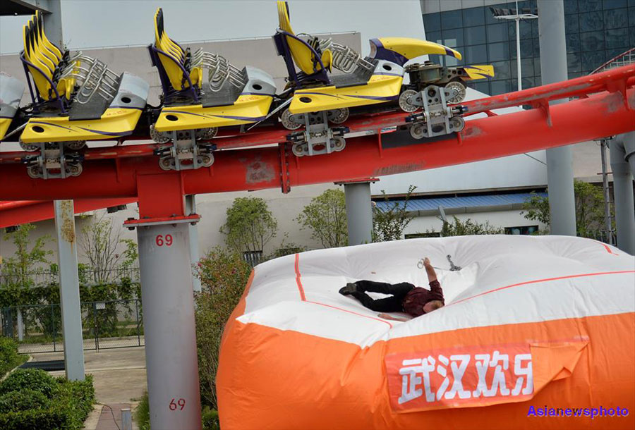 The roller coaster arrives as Gunnarson jumps from the track at a theme park in Wuhan, central China's Hubei Province on September 28, 2015. [Photo: Asianewsphoto]