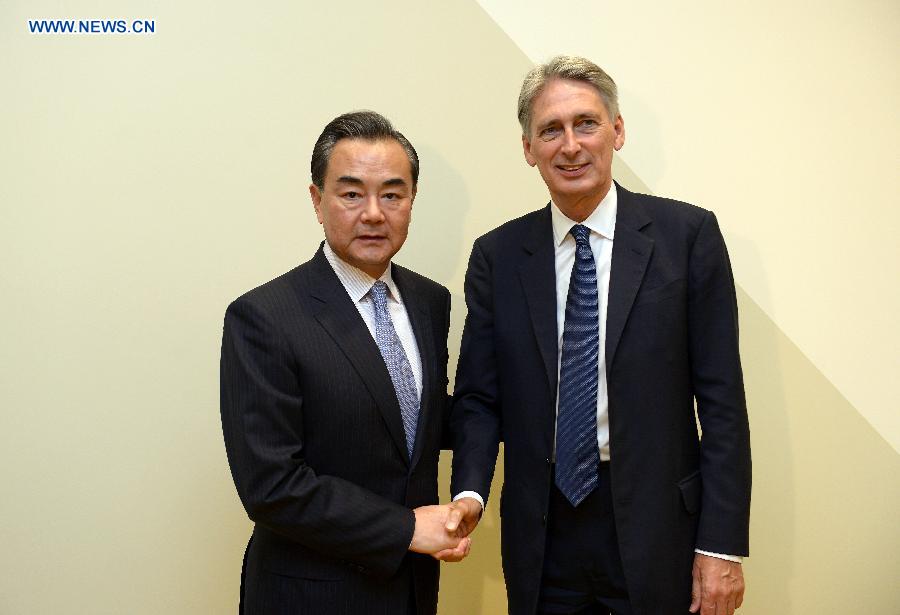 Chinese Foreign Minister Wang Yi (L) meets with British Foreign Secretary Philip Hammond at the United Nationsheadquarters in New York Sept. 29, 2015. (Xinhua/Yin Bogu)